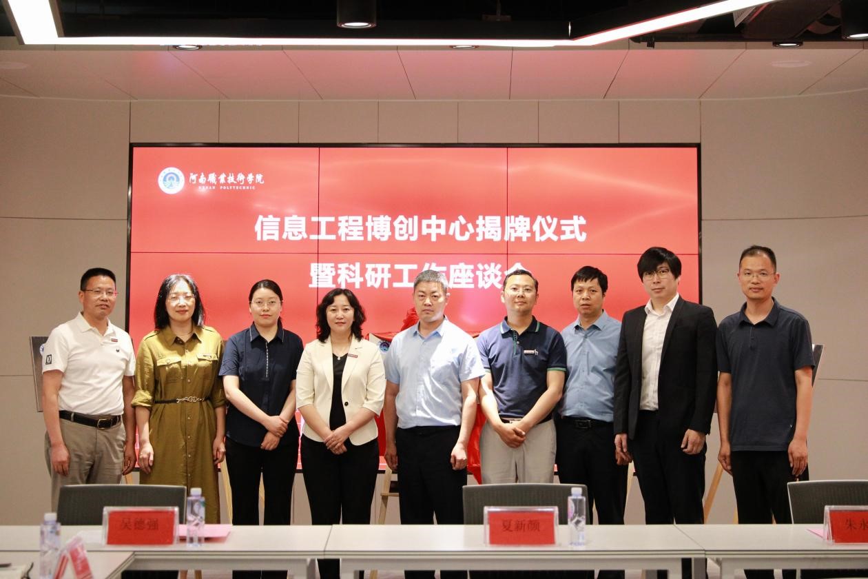 5月30日是第九个全国科技工作者日。学校在河职创新港大数据双创基地举行信息工程博创中心揭牌仪式暨科技工作者座谈会。校党委副书记、校长夏新颜,校党委委员、副校长朱永宽出席活动。党委教师工作部、科技开发处负责同志,现代信息技术学院相关负责同志、博士和师生代表参加活动。