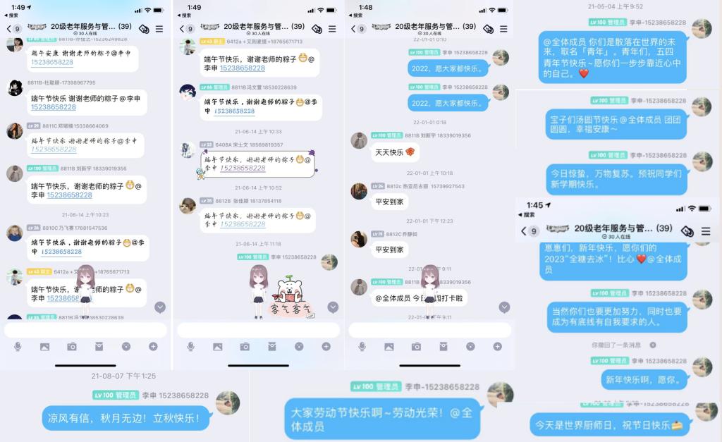 平凡即意义,琐碎才真实。李申对学生们的关心体现在每一个琐碎的日子里,比如:端午节,她给全体同学煮粽子;立冬时,她给学生烤地瓜……认真细腻的性格让她在学生中颇受好评。2022年夏天,班里一位学生突然提出休学申请,这引起了李申的注意,经过谈心谈话,李申了解到该同学因家人突发疾病陷入经济困难,学业难以为继,李申自掏腰包一次性转给该同学2000元解燃眉之急,随后帮助学生积极了解资助政策,帮她渡难关。无独有偶,2022年冬天,李申接到了老年班一位学生的电话,因实习单位经营困难,未能按时发放实习工资,生活陷入困境,李申又一次毫无犹豫转过去2000元帮助该学生正常过冬。